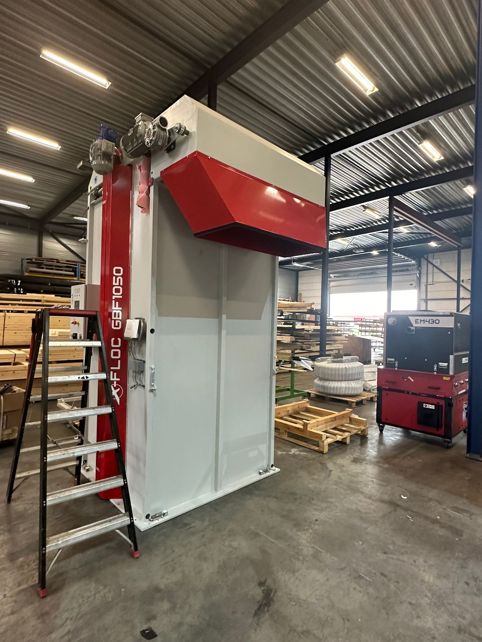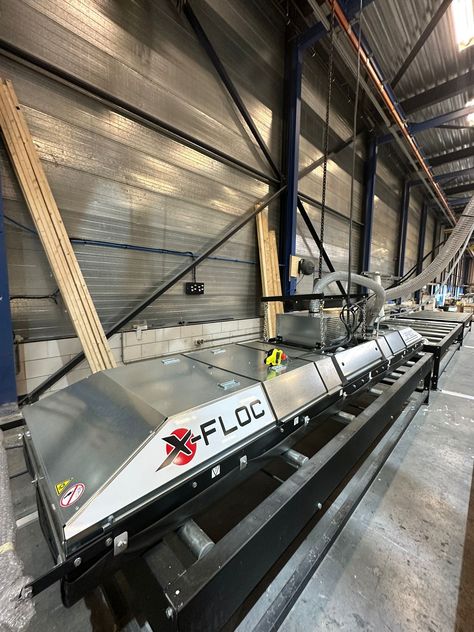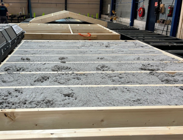 Bij deze houtskeletbouw fabriek in Gelderland is door H&M Machine installaties een semi-automatische inblaasplaat / vulinstallatie geplaatst.